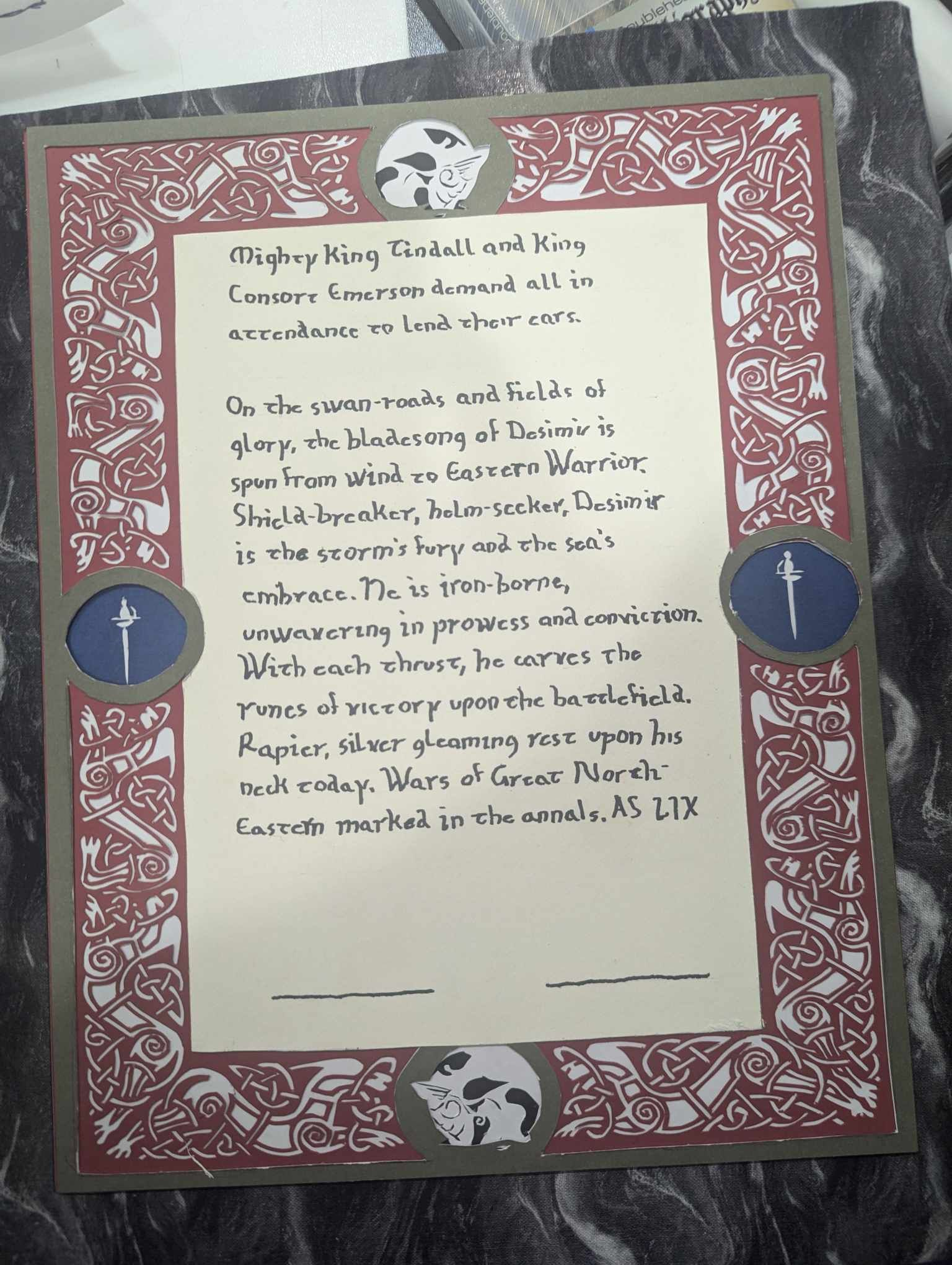 Úlfarr is another human who has been in my life for several years. He works hard and is an incredibly skilled story teller. When you see him in full blown Bard, it’s captivating. I’ve been lucky to also serve as a mentor to him for running events but also to see him grown in his own with service to the College of Performers as well as service to his Barony. When the scribe asked me to wordsmith this scroll, I was overjoyed. I hope he feels the same way.