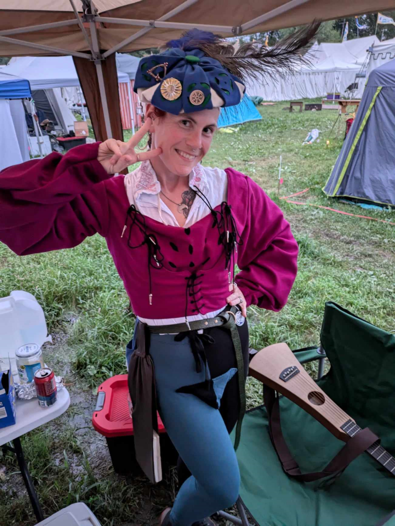 All in attendance, tremble before the Harper, Seigne Ruadh Frizzel. Pray heed this ethereal being with a harp song that claims a listener’s heart as truly as her hunter’s shot claims a stag on the fly. With fingers that dance on strings, she weaves melodies that captivate while her arrows wing true. Like Apollo, who excelled in both archery and music, this harpist-archer seamlessly blends the elegance of her melodies with the precision of her aim. Warm is her heart as is the hearth of her home. All are welcome and so we celebrate Seigne.