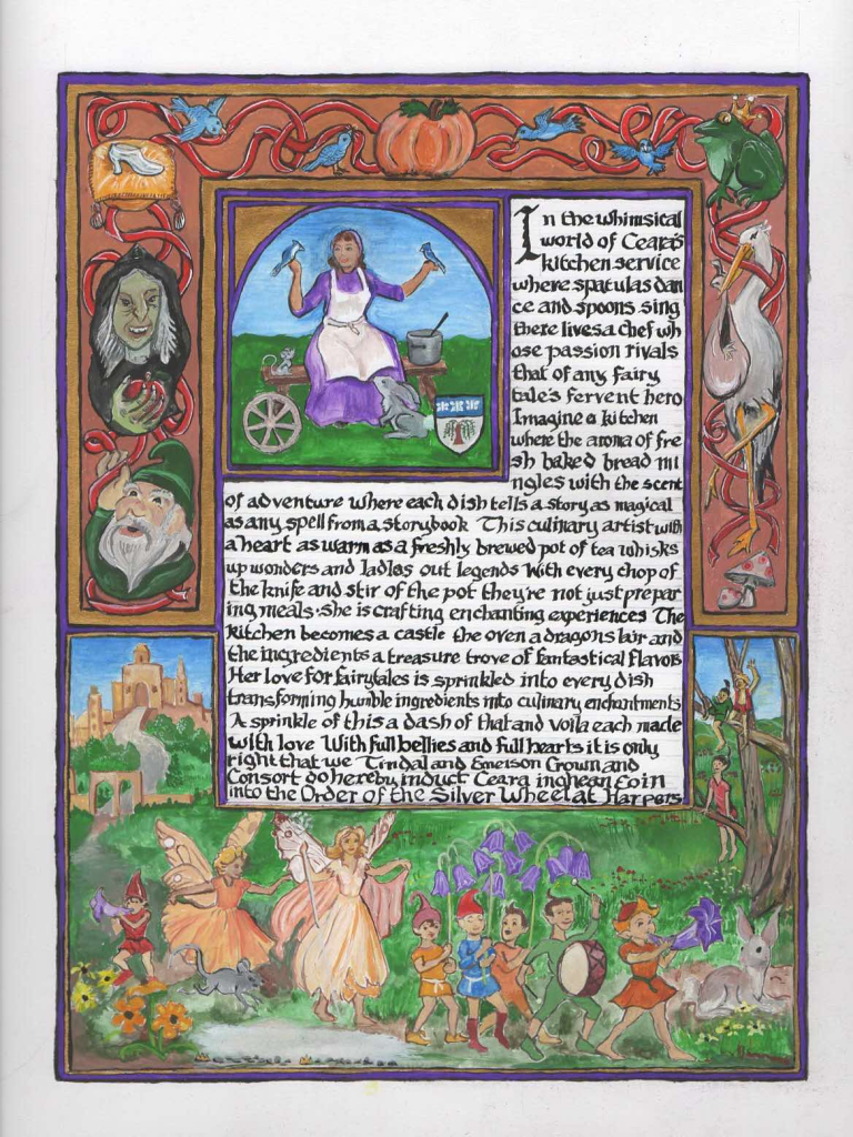 I always loving doing scrolls for friend’s. This was a very long time due scroll and I am glad that the scribe reached out to me to wordsmith. I have known Ceara since about a year after she and her spouse (at the time) moved to the East Kingdom from Drachenwald. We became close bardic friends. She is who I go to regarding fairy tails. She could give you 3 period versions of Cinderella if you asked her to. However, she has magic in the kitchen when she cooks so I wanted to combine both of those things. I do mix pronouns on purpose.
