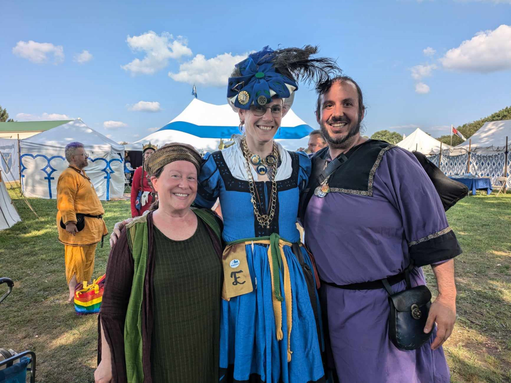 Later in the evening I would be orchestrating and performing in the Runnymeade Dinner. This is a gathering of all the landed Baronages of the East Kingdom. I was originally asked to bring “High Italian Aria” like feeling to their Excellencies. I had also recruited Amalie to sing a solo and a Duet with me. She sang “It was a lover and his lass”. As a duet, we did Machaut’s “Je Ne Cuit Pas”. This piece is in Occitan french so additional pronunciation research had to be done. And I finally finished with I’vo’ Bene. by Firenze The below picture captures 3 generations so to speak. My Laurel, Sabine, Myself and my student, Drustan.