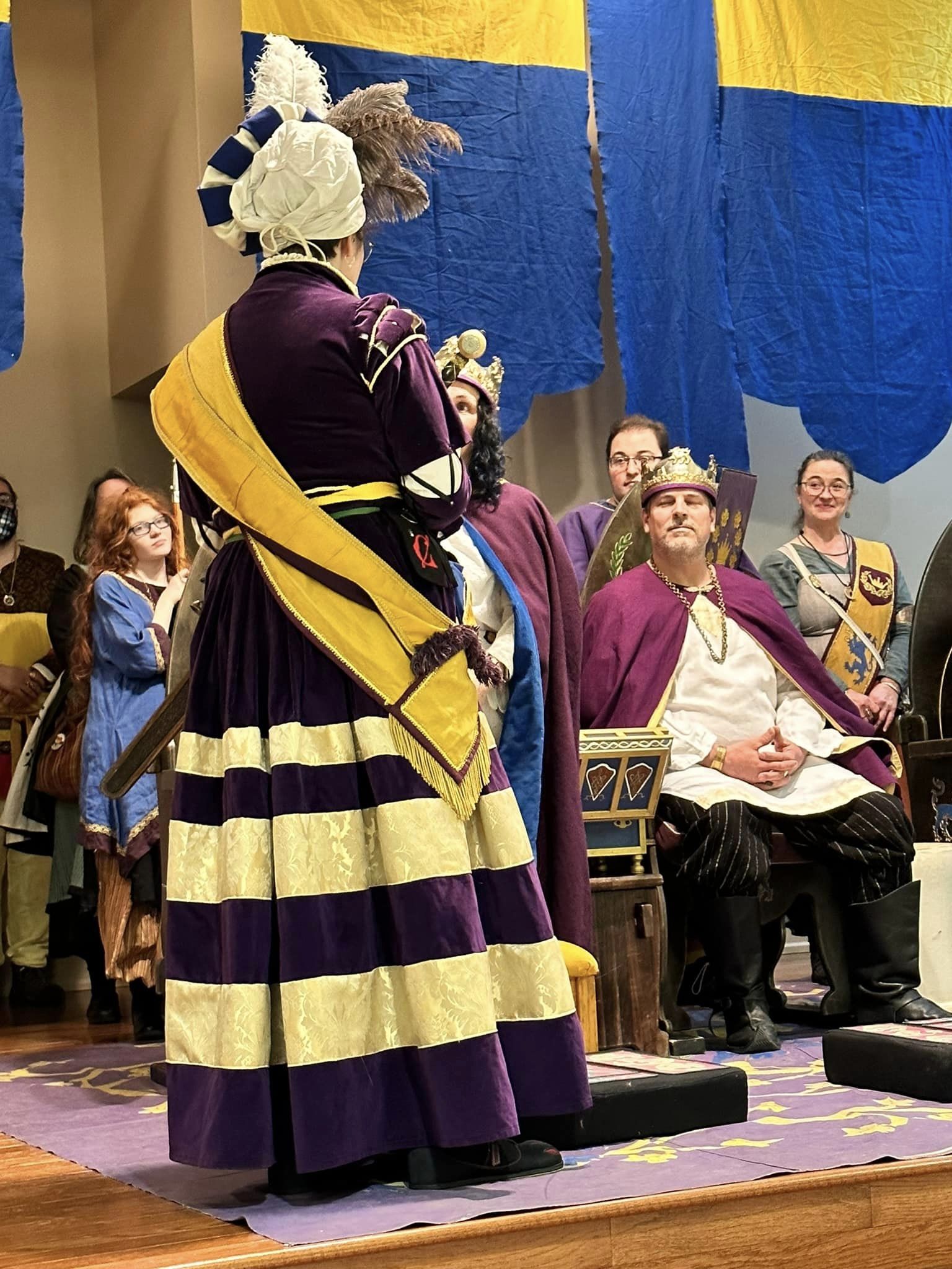At that point I thought the day was over. I got to rejoin my husband, sitting in court, my friends who were not on the Dias and friends I had not met yet. I was sad I didn’t get to see the new scrolls given out in court. I was always so overjoyed when I got to see the scrolls as they were being read. I got to hear the speech between the recipient and the royal and now I would be sitting back with everyone else. It was really nice feeling special and seen for the last 9 months. I still got to pop up to greet those in the orders I was a part of, but somehow, it wouldn’t be the same.